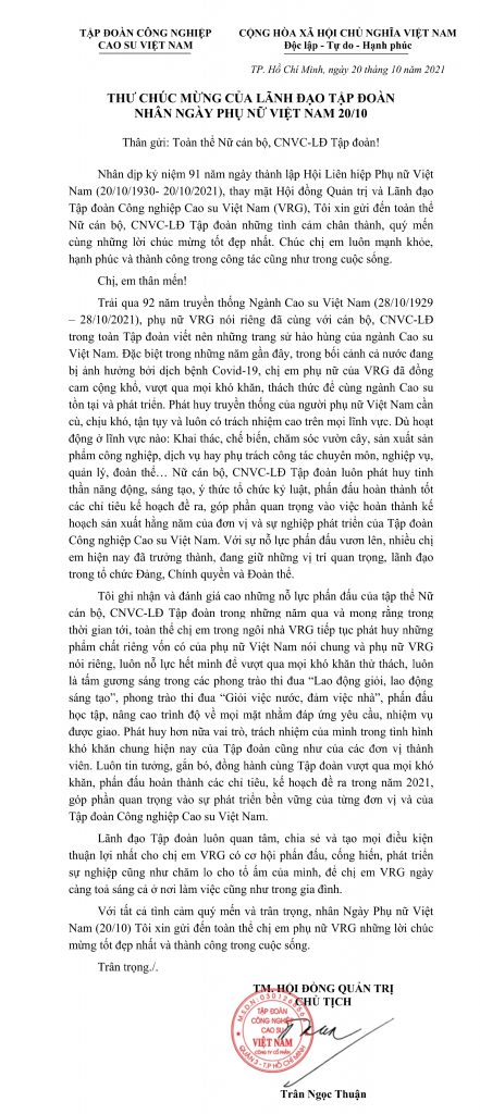 Thư chúc mừng của Lãnh đạo Tập đoàn nhân ngày 20/10